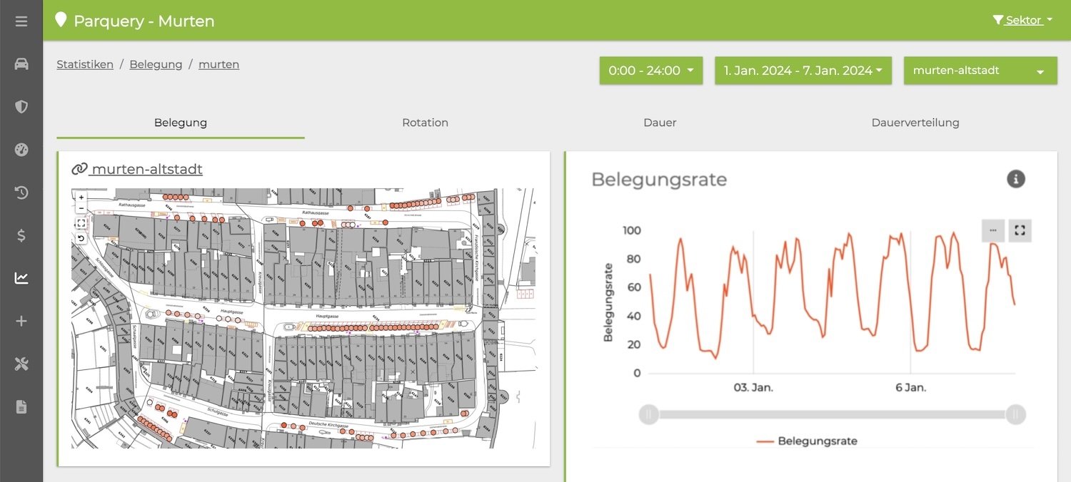 On most days, Murten recorded a high daily parking occupancy (80 - 95%) in the city center, particularly in the old town and its immediate surroundings, while areas further away had free capacity.